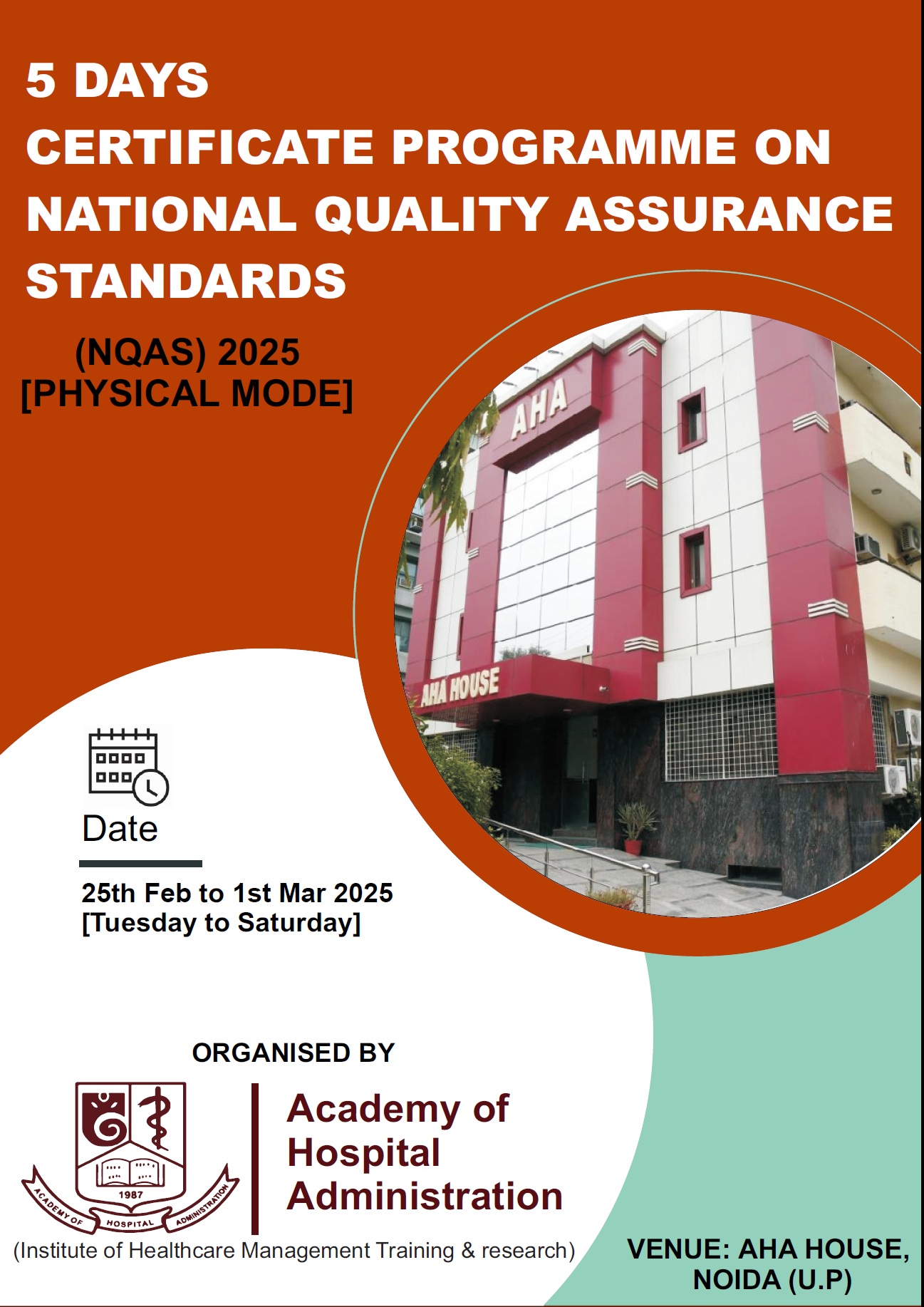 We are pleased to announce the launch of our 5 Days - NQAS Certificate Programme in PHYSICAL MODE at AHA House, NOIDA.